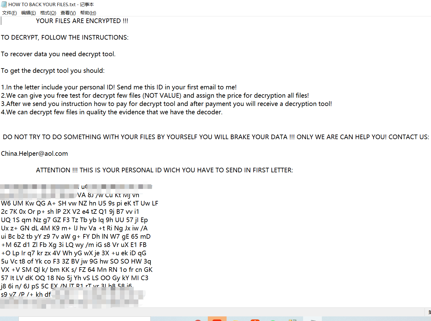 10月8日,我司接到安徽某物业公司的求助电话,称其服务器整机被勒索病毒加密,所有文件都打不开了,后缀名是邮箱加一串ID,这是典型的crylock勒索病毒